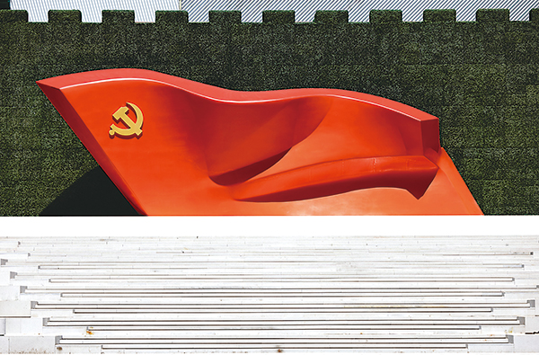 中国共产党历史展览馆西侧广场正北侧中间,雕塑《旗帜》犹如一面迎风招展的巨大党旗,气势如虹,金色的党徽光辉夺目。(中国美术馆供图)