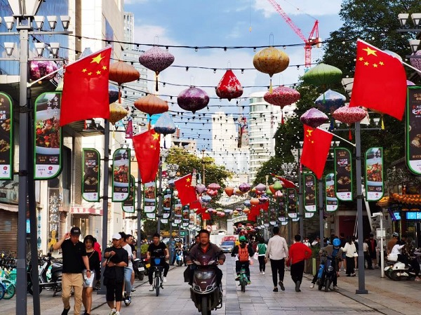 五星红旗迎风飘扬,街道挂上了彩色灯笼,城市到处都洋溢着浓浓的节日氛围。(杨雪娇 摄)