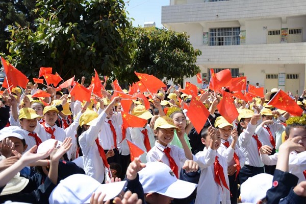 在国庆节到来之际,大理白族自治州祥云县一所小学正开展丰富多彩的庆祝活动,一张张纯真灿烂的笑脸是对祖国母亲73周年华诞最好的祝贺。(徐翔 摄)