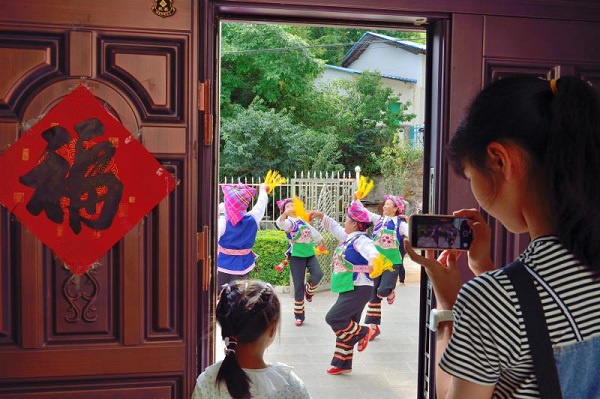 国庆节来临之际,红河哈尼族彝族自治州建水县彝族群众欢聚一堂,身着绚丽盛装,跳起了热情洋溢的舞蹈,用欢快的节奏和舞姿喜迎国庆节的到来。(卢维前 摄)