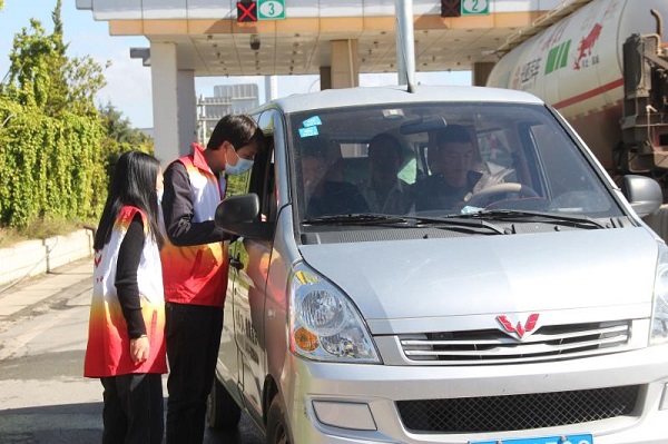 节假日人员流动频繁,大理白族自治州祥云县青年志愿者积极协助辖区卫生院在收费站路口对来往车辆及人员进行排查,为疫情防控工作贡献青春力量。(张春 摄)