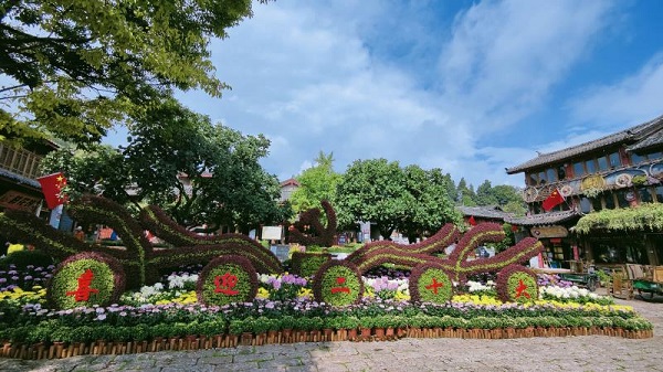 丽江市古城区四方街中的花朵们,共同表达着人们的心声。(王元春 摄)