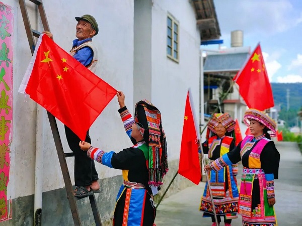 国庆节,保山市龙陵县平达乡河尾村的傈僳族群众在家门口悬挂国旗,营造喜庆祥和的节日氛围,表达对祖国母亲的无限热爱和感激之情。(王龙芹 摄)