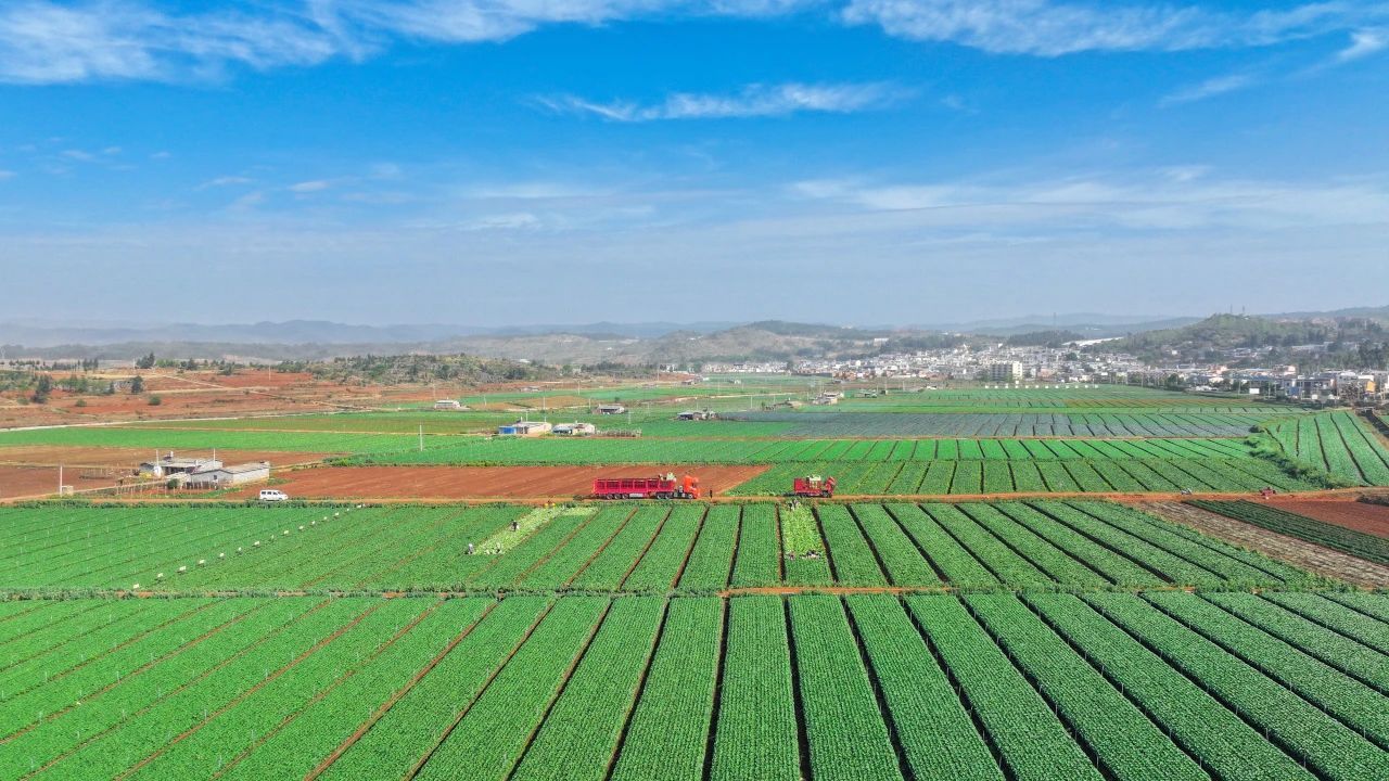 在祥云县万亩标准化蔬菜大棚,泰兴农业科技公司的工人们正小心翼翼地采摘着成熟的蔬菜,一筐筐鲜嫩欲滴的蔬菜被整齐码放,即将踏上远行的旅程。