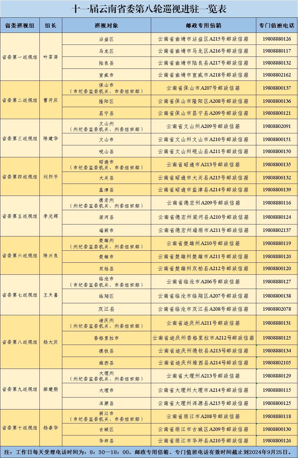 省委各巡视组将在有关被巡视地区工作2个月左右。巡视期间设专门值班电话、邮政专用信箱,主要受理反映被巡视党组织领导班子及其成员,下一级党组织主要负责人和重点岗位人员问题的来信来电来访,重点是违反政治纪律、组织纪律、廉洁纪律、群众纪律、工作纪律和生活纪律等方面问题反映。其他不属于巡视受理范围的信访问题,将按规定由被巡视地区和有关部门认真处理。省委巡视组受理信访时间截止到2024年9月25日。(云南省纪委监委 || 责任编辑 于露)