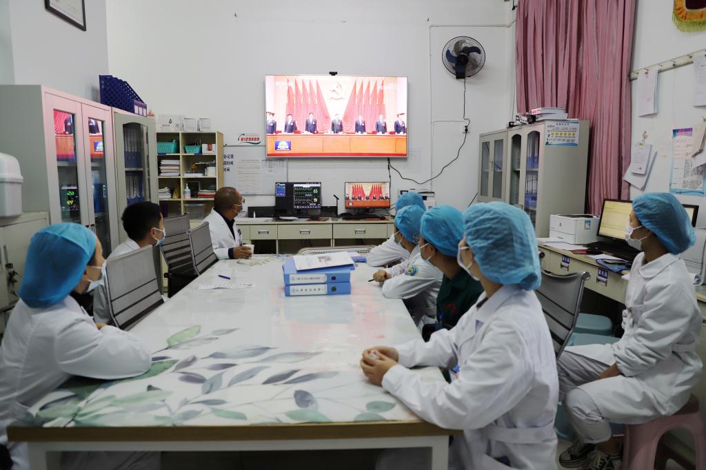 县人民医院急诊科医护人员通过电视收听收看全会直播。(刘靖玲 摄)