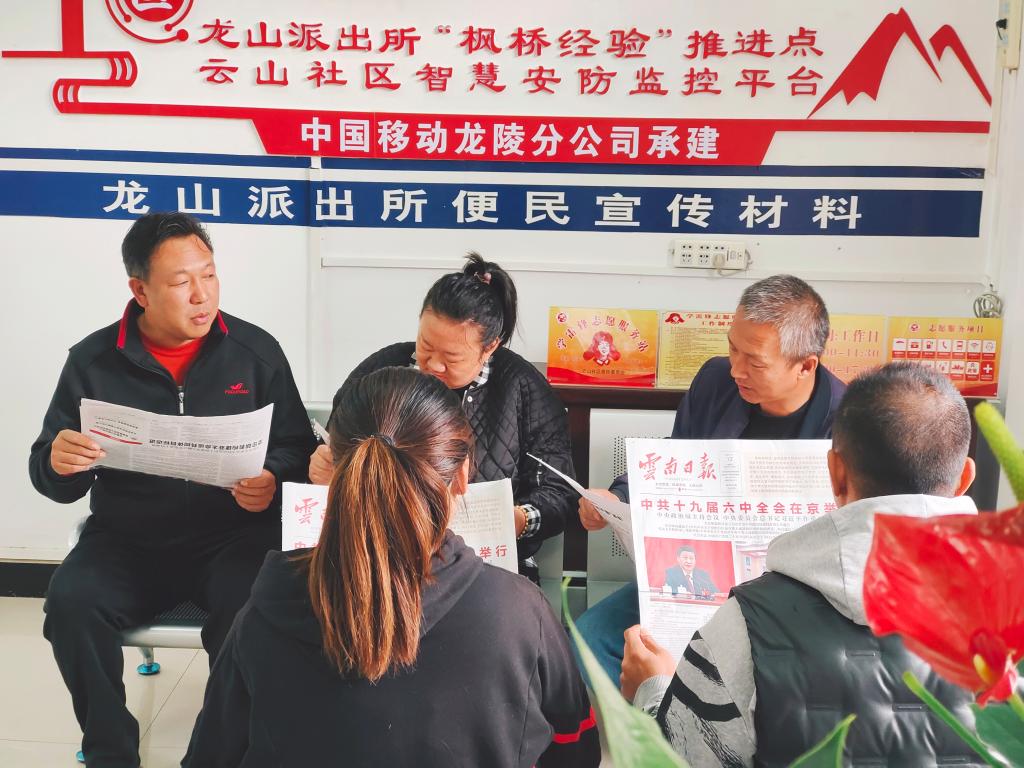龙山镇云山社区干部通过报纸进行宣传学习。“作为基层社区干部,我们深知贴近群众的重要性。唯有坚决贯彻党的群众路线,从解决群众的实际困难入手,全心全意为群众办实事、解难题,才能真正取得老百姓的信任和支持,我们的事业才能有底气、有动力!”云山社区党总支书记说到。(王龙芹 摄)