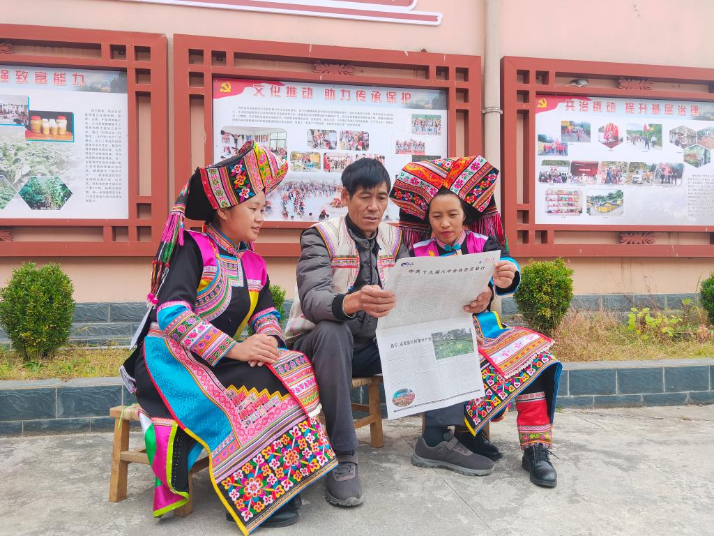 平达乡黄连河村傈僳族群众在文化广场学习讨论全会精神。(段丽芬 摄)
