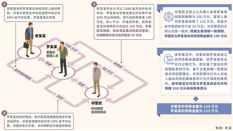 叶子茂:我们经研究认为,祁登武和罗某某在100万元范围内构成共同受贿,祁登武的受贿金额为100万元,罗某某的受贿金额为120万元。理由如下:按照主客观相一致的原则,祁登武和罗某某在收受廖某某的行贿款时,双方商定收取廖某某100万元,事后双方平分该100万元。但罗某某在与廖某某的实际沟通过程中,廖某某坚持送给两人120万元,罗某某并未将该实际情况告知祁登武,祁登武主观上无法得知廖某某实际送给了罗某某120万元,罗某某分给祁登武的50万元也与两人之前商量好的平分方案一致。因此,综合全案证据来看,祁登武主观上认为两人收受廖某某钱款的数额为100万元,客观上虽然罗某某收取了120万元,但是分给祁登武的也只有50万元,与祁登武的主观认识是一致的,据此,祁登武与罗某某在100万元范围内构成共同受贿。