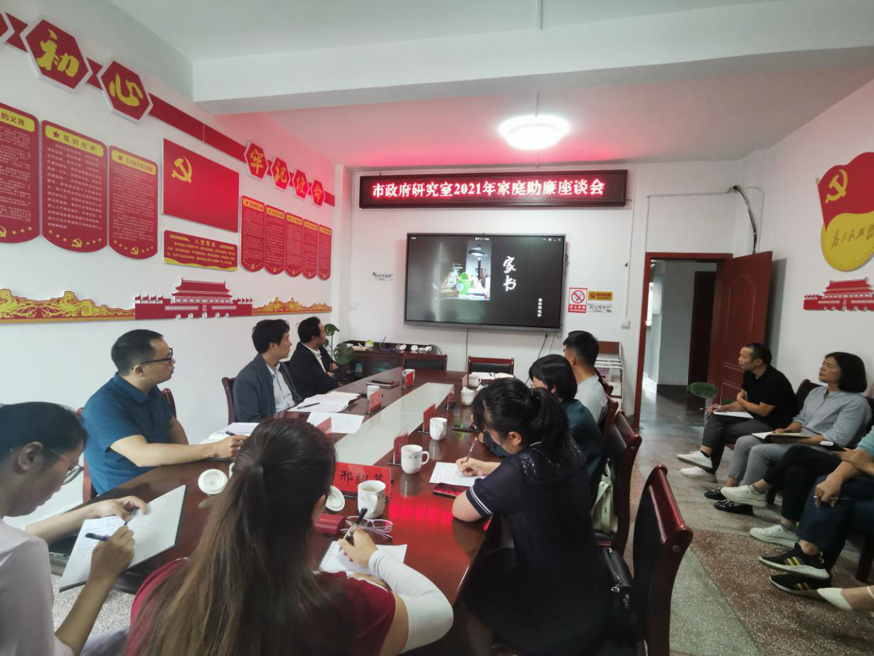 为落实落细全面从严治党要求,提高领导干部廉洁从政意识,推进家风建设,9月18日下午,市政府研究室召开2021年家庭助廉座谈会,全室干部职工和家属及市纪委监委派驻市政府办纪检组领导参加了会议。