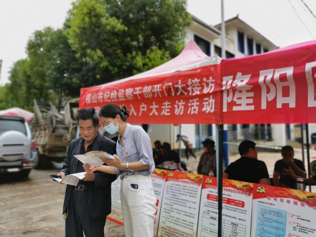 “您好,我们是隆阳区纪检监察干部,如果您发现乡干部、村组干部有违规收费、吃拿卡要等情况时,请及时向我们进行举报!”这是隆阳区纪检监察干部“开门大接访、基层大下访、入户大走访活动”隆阳区西邑乡专场的展摊前,隆阳区纪检监察干部向赶集的村民收集诉求、宣传信访流程的一个场景。