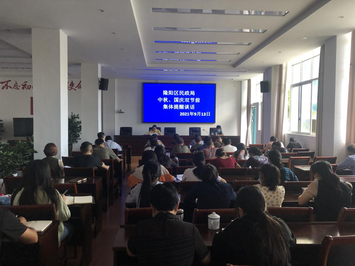 中秋、国庆双节将至,为深入贯彻落实中央八项规定精神,进一步强化干部职工廉洁自律意识,营造崇廉尚俭的节日气氛,9月13日,隆阳区民政局开展中秋、国庆双节前党风廉政建设推进会暨集体廉政谈话。