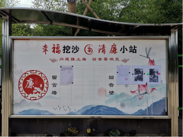挖沙村的“清廉小站”分为“问题摆上墙、回音要响亮”两个版块。“问题摆上墙”由群众向村委会反映关于生产生活、村务公开、公共基础设施建设、环境卫生等各方面的困难和意见并填写上墙;“回音要响亮”是村委会经过召开会议集体研究后上墙公布整改问题的组织保障,明确办结时限、责任人、取得的成效,接受村监委会和群众的监督。截至目前,挖沙村的“回音壁”上墙问题2件,已解决2件。