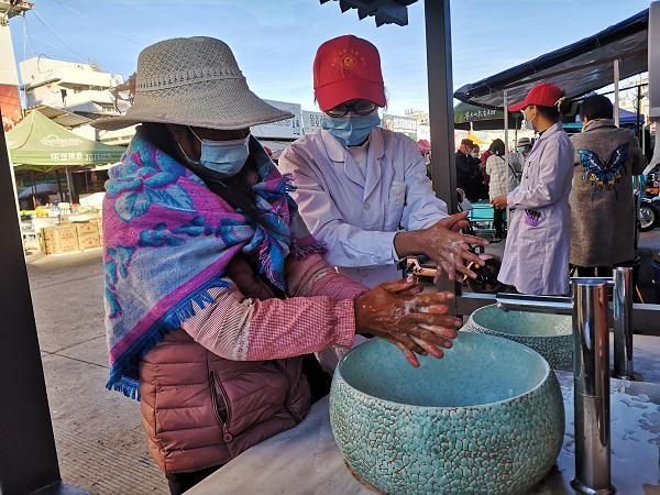 “大妈,您看,洗手的正确步骤是这样的……”祥云县卫健系统的志愿者们走上街头,教群众七步洗手法,引导群众养成勤洗手、讲卫生的好习惯。(赵秋艳 摄)