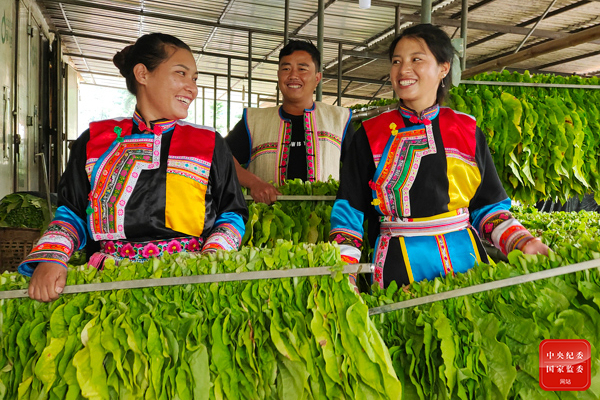烤烟进入采摘旺季后,云南省龙陵县平达乡安乐村烤房里一杆杆整齐的烟叶让烟农们忘却炎热和酷暑,丰收的喜悦溢满脸庞。(云南省龙陵县纪委监委供 王龙芹 摄)