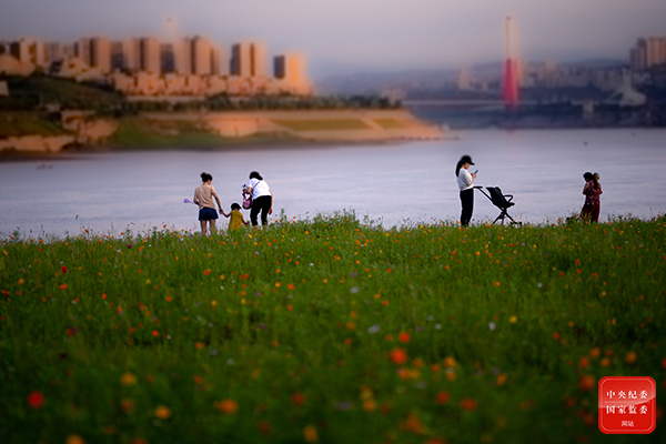 重庆市万州区江边的草地上,鲜花盛开,凉风习习,市民们在这里散步乘凉,十分惬意。(重庆市万州区纪委监委供 魏若谷 摄)