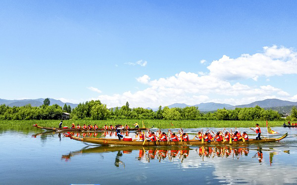 盛夏时节,剑川县沙沟尖村组织划船比赛,村民们在戏水娱乐中享受清凉一刻。(王开华 摄)