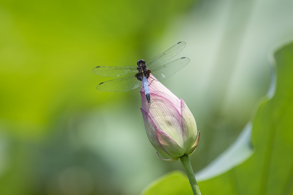 荷花还没完全绽放开来,但是花香早就夹杂在微风中,借着荷香送来清凉。蜻蜓款款飞来,立在荷花上,令人赏心悦目。(李维梅 摄)