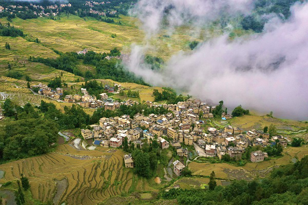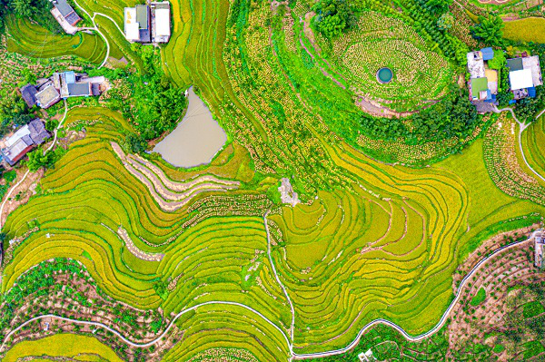 处暑时节,秋风渐渐将梯田染成金黄,水稻在连片的梯田中长势喜人,丰收在望。(张朝福 摄)