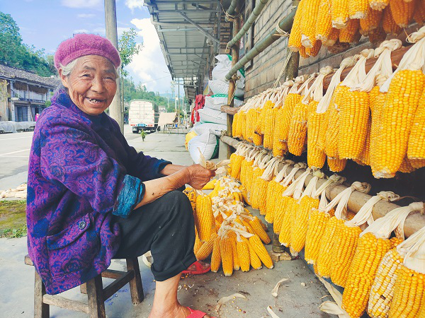 农家门口,农户给金黄饱满的玉米棒打着结,笑容满面。(王龙芹 摄)