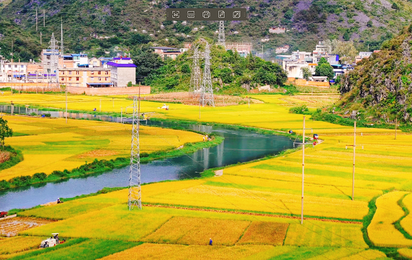 黄绿相间的稻谷镶嵌在河道两边,丰收的景象在收割机的轰鸣声中荡漾。(谢昭瑾 摄)