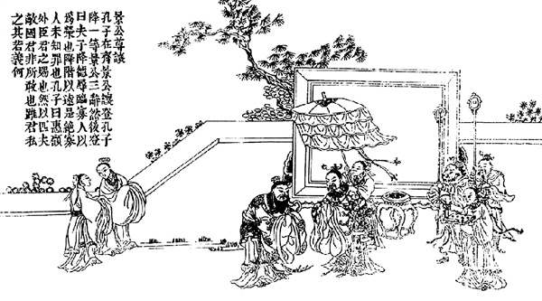 清同治十三年(1874年)孔宪兰刻本《孔子圣迹图》之《景公尊让》。孔子到齐国,齐景公接见他,请他入上座。孔子认为给他设的座规格太高了,请求降一等。齐景公再三要孔子入上座,说:“先生今天来到这里,寡人认为是极大的荣幸。怎么肯让先生坐在下面,这不是让你远离寡人吗!”(资料图片)