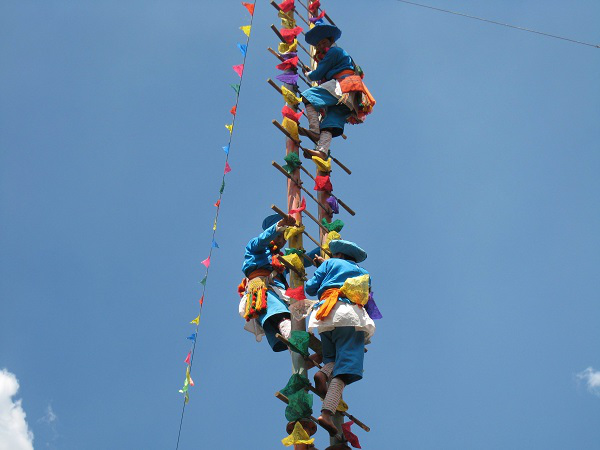 在腾冲市猴桥镇胆扎村里,热情的傈僳族人民为远道而来的游客演绎传统的“上刀竿、下火海”节目。(官智钦 摄)