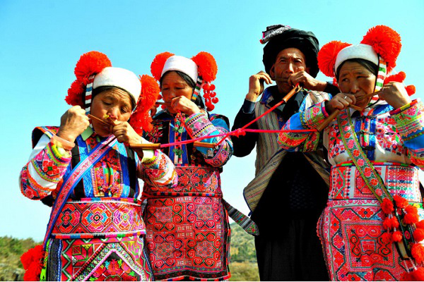 泸西县白水镇小直邑村彝族村民演奏“口蔑”。(康关福 摄)