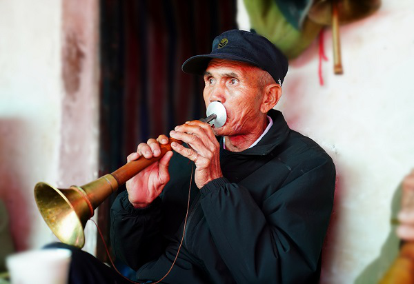 勐海县勐阿镇纳京村一位拉祜族老人在家人的婚礼上吹响了唢呐。(陶玲红 摄)