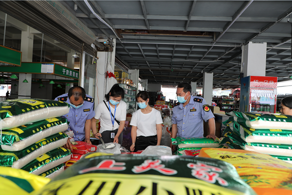 文山市纪委监委注重群众“舌尖上的安全”,和市场监管局组成联合检查组,对粮食生产安全开展监督检查,确保群众吃得放心安心。图为联合检查组在超市检查大米。(王铭坚 摄)