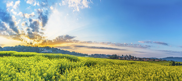 朝霞灿照,炊烟四起,花海漫山……对于腾冲市清水佤族人民来说,这就是幸福。(李恒宇 摄)