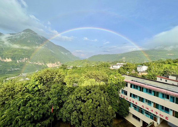 雨后天晴,一道彩虹挂在天空上,“为民务实清廉 忠诚干净担当”的字样在彩虹下格外显眼。(郑少飞 摄)