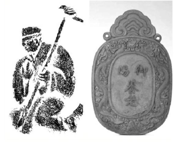 左图:鸠杖是古代赐给老者的荣誉,是身份的象征。这是汉代画像石中持鸠杖的老者形象。(资料图片)右图:为表达国家敬老尊贤之意,清朝举行了四次千叟宴,并向老者赐养老牌。这是1785年的一块“御赐养老牌”。(资料图片)