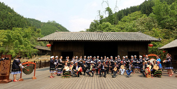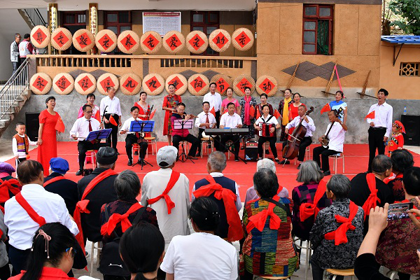 九九重阳节,浓浓敬老情。在曲靖市布依村寨里,大家身着节日盛装,通过民间曲艺“八音坐唱”的形式,共同欢度节日。(方俊 摄)