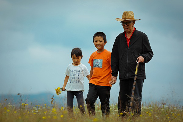 九月九日眺山川。重阳佳节,一对小兄妹陪爷爷在开满野花的山顶上散步。(王勇 摄)