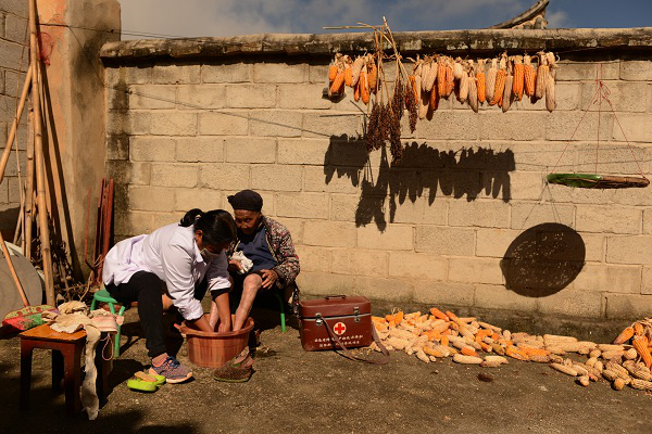 红河县甲寅镇组织乡村医生走进空巢老人家中,给老人们义诊、泡足、理发、剪指甲,为他们送去节日的祝福,让老人们感受到节日的温暖。(王峥 摄)