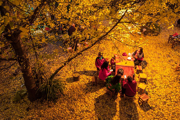 琉璃般的光线透过树叶罅隙打在满地落叶上,在这个温暖而美好的童话世界里,与家人小聚,赏美景、品美食,人生快事。(李新位 摄)