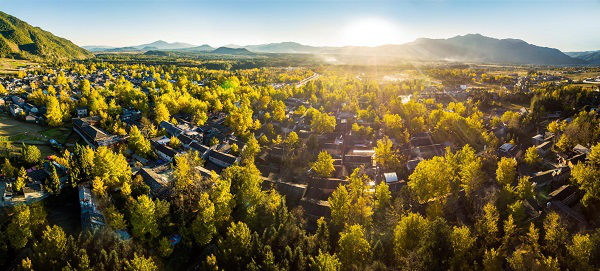 金黄色的树叶纷纷扬扬飘洒而下,覆盖了房舍和农田,整个村庄掩映在一片金黄的灿烂之中。(李恒宇 摄)