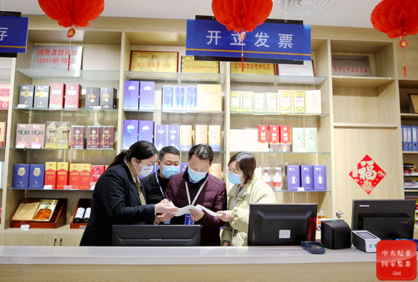 浙江省浦江县纪委监委联合相关职能部门组建“清风护航”专项检查组,深入烟酒茶叶专卖店、饭店、娱乐场所等,深挖细查是否存在违规吃喝、违规收送礼品礼金、享乐奢靡及其他隐形变异“四风”问题。(浙江省浦江县纪委监委 洪小岚 摄)
