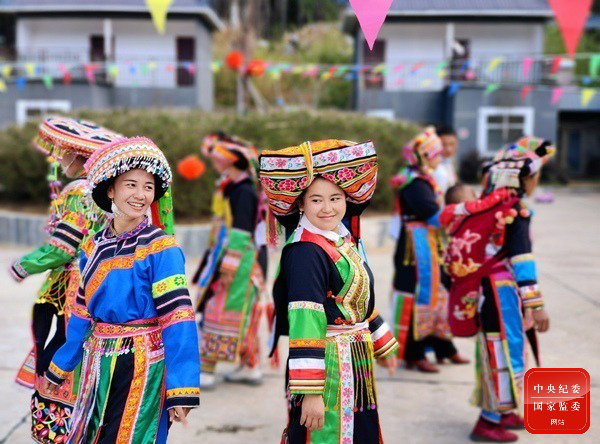 在云南省龙陵县腊勐镇龙潭山易地搬迁点,傈僳族同胞们唱曲、“打歌”,弹三弦、吹竹笛,祈福纳祥、辞旧迎新,在丰富多彩的文化活动中欢天喜地过大年。(云南省龙陵县纪委监委供 王龙芹 摄)