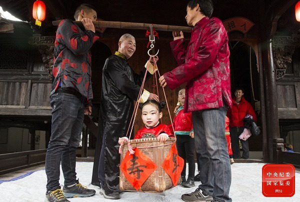 过年“称岁”,是浙江省永康市乡村的习俗。每年春节,村里的长辈都要拿喜称给孩子称体重,寓意新的一年增重添福、称心如意,平平安安。(浙江省永康市纪委监委供 朱李刚 摄)