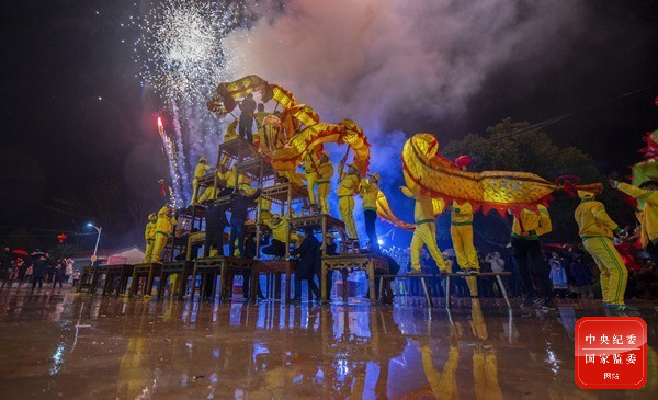 板龙闹春,迎禧接福。舞板凳龙是徽州人迎接新春的习俗。又是一年新年到,在璀璨绚丽的烟花下,人们齐聚一堂,舞起板凳长龙,共同祈福来年国泰民安、幸福吉祥。(安徽省宣城市宣州区纪委监委供 黄利宏 摄)