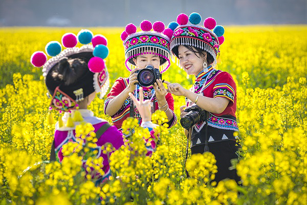 春分时节,牟定县蟠猫乡刘家村的油菜花开成了一片黄色的海洋,众多游客和摄影爱好者到此踏青赏花,“打卡”拍照。(李光洪 摄)