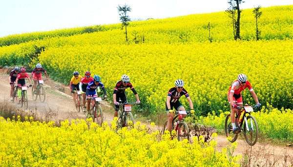 春分时节,曲靖市百万亩油菜花盛开,吸引广大骑行爱好者来到花海中骑行健身,感受春日美景。(文萍 摄)