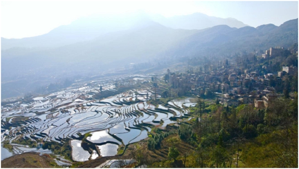 春分时节,哈尼梯田春意盎然,满眼皆是山水、村寨、绿植,与五彩的梯田相得益彰,铺开了一幅浑然天成的自然和谐画面。(李少福 摄)