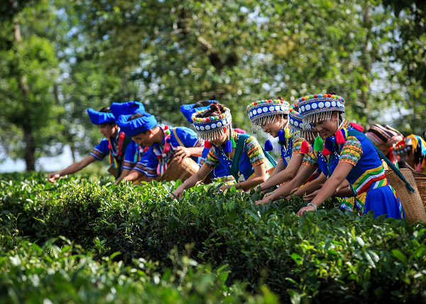 人间三月,茶园里绿意盎然,傈僳族姑娘小伙身着节日盛装,背着小背篓相约到茶园里采茶,绿意盎然的茶园不时传来阵阵欢歌。(解宏伟 摄)