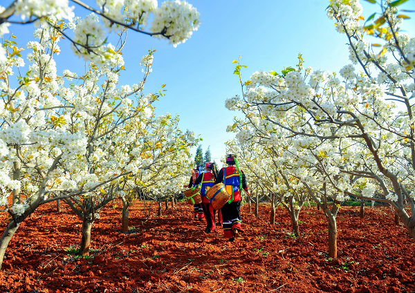 雪白的梨花在春日里盛开,点缀了漫山遍野。约上三五好友踏春赏花,感受柔美春光,沉醉在春日美景里。(康关福 摄)