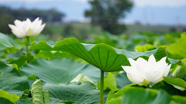 “灼灼荷花端,亭亭出水中”。白朵朵荷花,静立风中,在初秋阳光的映衬下,泛着耀眼的光。(李文艳 摄)