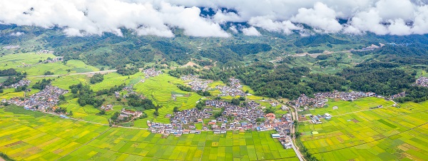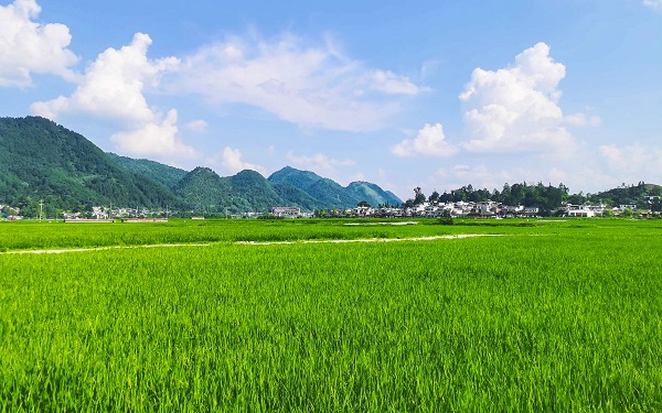 暑去秋来,天气渐凉。稻田里的水稻长势喜人,满眼碧绿,与村庄相映成趣,美不胜收。(杨保宇 摄)