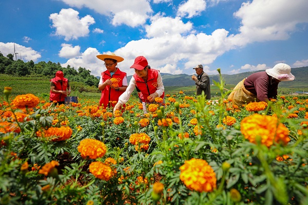 一席秋风凉,黄花遍地香。处暑时节,陆良县活水乡雨麦红村的千亩万寿菊竞相绽放,花海连绵,小朋友跟着家长一起参加志愿服务活动,帮助花农采摘万寿菊。(王勇 摄)